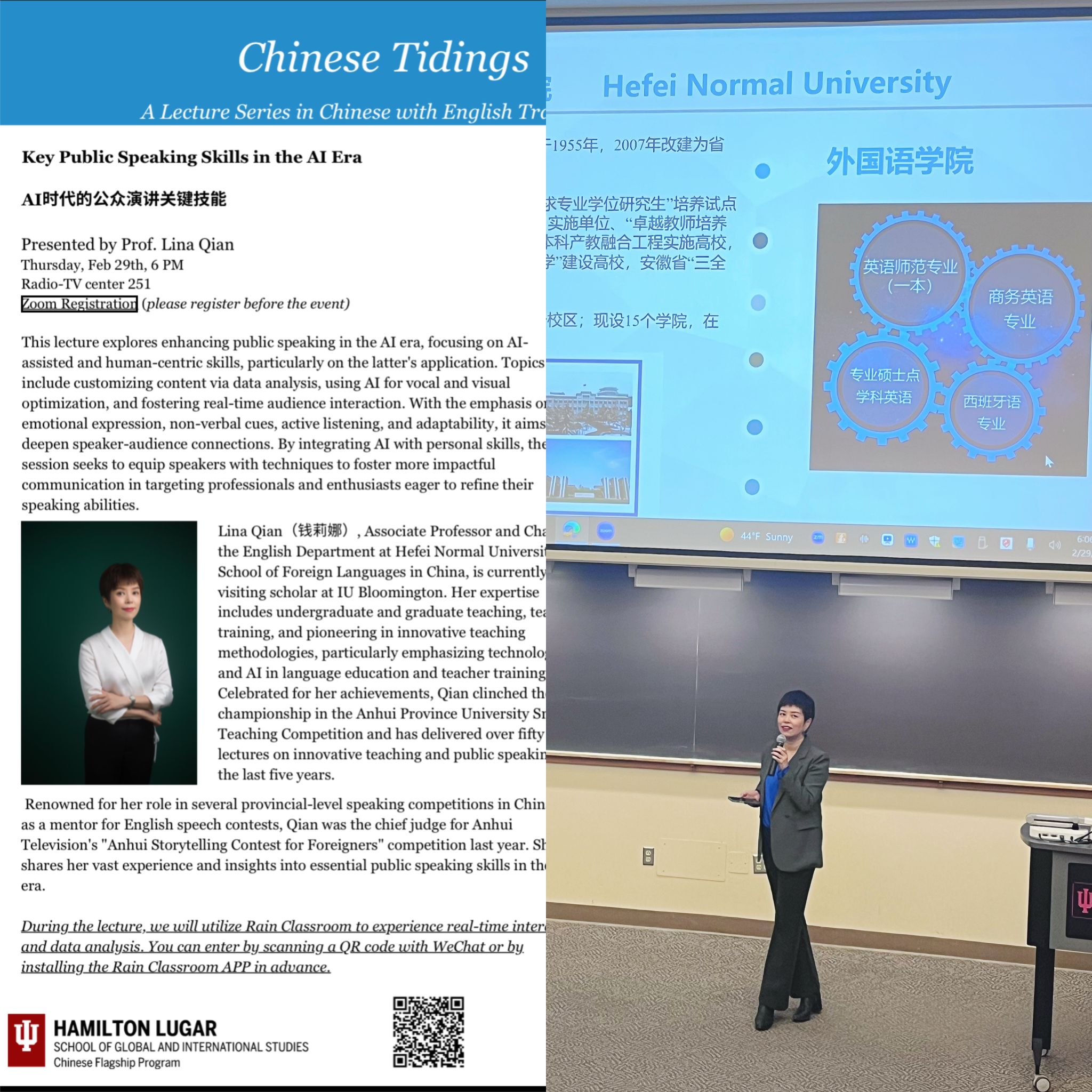 3月初,受美国印第安纳大学中文领航项目的邀请,威廉希尔williamhill副教授、英语系主任钱莉娜老师开展了一场题为“AI时代的公众演讲关键技能”讲座,印第安纳大学中文领航项目师生、其他公司的部分师生到现场参加讲座,同步进行网络直播,部分师生在线上参加了本次讲座。钱莉娜副教授在美国印第安纳大学的两位访学导师也到现场参加了本次讲座,他们分别是印第安纳大学教育公司Cur Bonk教授和语言技术中心主任寇晓静博士。