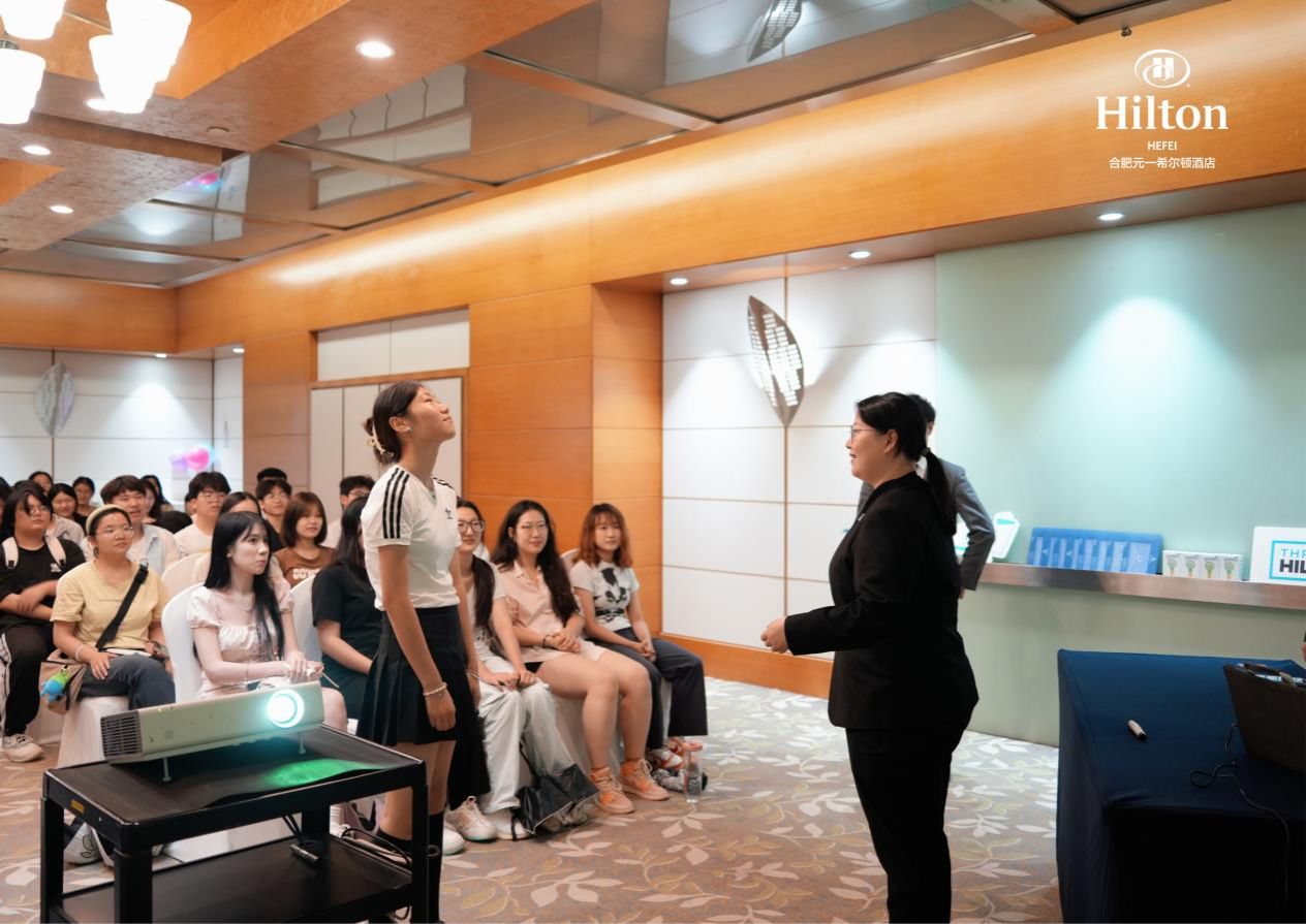 为了全面系统地了解行业动态,更好地理解酒店行业对商务英语人才的需求,6月19日下午,商务英语 2023 级员工在系主任史以一、专业实习实践负责人郑蔚康及专业辅导员朱儒进的带领下,前往合肥元一希尔顿酒店,开启了一场别开生面的专业实践活动。
