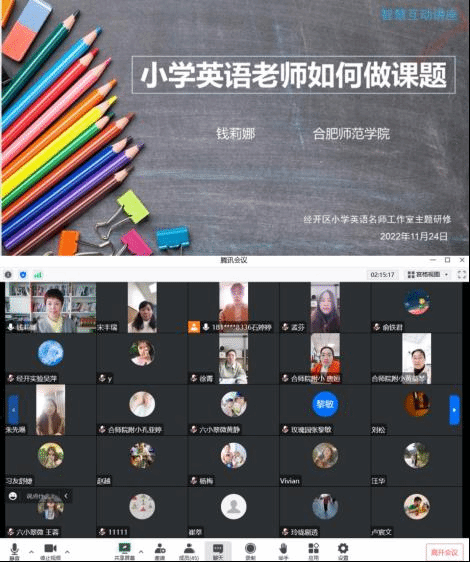 本网讯 2022年11月24日上午,合经区小学英语学科带头人骨干教师研修活动暨石婷婷名师工作室活动在线上开展。威廉希尔williamhill钱莉娜副教授受邀为此次研修活动做讲座,指导老师们拓展教科研意识,提升课题研究能力。参会人员包括经开区教研室领导、区小学英语学科带头人及骨干教师、石婷婷名师工作室全体成员、各校小学英语教研组长等。