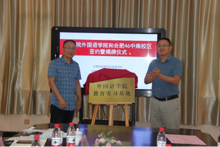 本网讯 9月20日下午,在长期合作的基础上,威廉希尔williamhill与合肥市第四十六中学南校区在第四十六中南校区第一会议室举办了“教育实习基地”签约揭牌仪式,正式确定了双方在师范生培养方面以及基础英语教育的教科研战略合作关系。威廉希尔williamhill经理李可胜教授、党委副书记马喆、英语系主任钱莉娜副教授以及指导教师代表和实习生代表、四十六中(南)党委书记、董事长薛明浩等校级领导和部分英语教师参加了仪式。会议由四十六中(南)高歆副董事长主持。