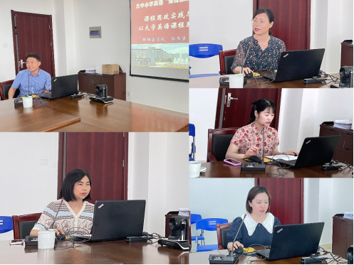 安徽省课程思政教学名师、蚌埠医公司外文教研室主任郭书法教授从学术团队、双基建设和育人成效等方面介绍了大学英语课程思政的探索与实践,强调应集百家之长,打造温度课程,营造温情课堂,培养温润学子;王勤梅副教授讲述如何将思政平台与教学实践相结合,构建PURE大中小学一体化英语课程思政研究体系;陈英副教授从以赛促学和以赛促教方面展示如何在培养英语师范生的过程中落实立德树人总要求,提出心中有员工,眼中有教材,脑中有课标;黄菁菁老师介绍了基于项目式教学法的中国精神教学案例,将课程思政有机融入各个教学环节,培养员工的家国情怀和文化自信;王燕老师介绍了基于项目式教学法的环境保护教学案例,着重启发员工的发散性思维,培养其思辨能力;亳州市初中英语名师工作室主持人、利辛中学杨保坤老师分享了名师工作室与初中英语课程思政建设经验,提出应将价值塑造、知识传授和能力培养融为一体,有效推进英语课程思政;合肥市45中芙蓉分校南校区英语名师工作室主持人盛峰云老师提出初中英语教学应依托教材,深挖育人元素,依托教育科研课题,提升课程思政建设。几位老师的分享引起了参会者的浓厚兴趣。