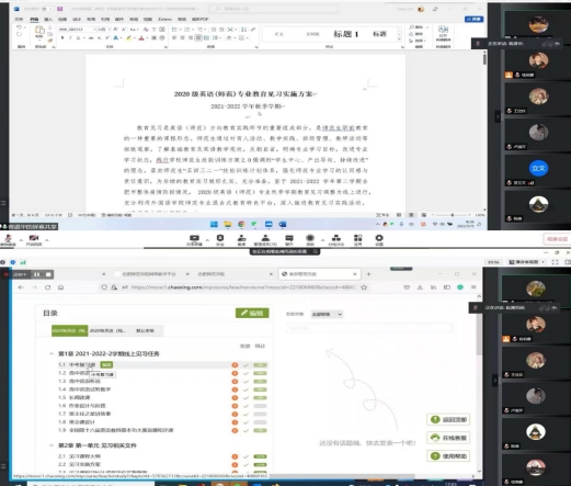 蒋道华教授在接下来的会议中对此次线上见习方案进行补充说明和强调,他说明此次见习是师范生的一个重要教学实践环节,着重强调此次见习活动包括班主任见习工作、英语教学实践活动见习、公司产品调查三方面的内容。陈英教授仔细介绍了此次线上见习的相关辅助学习资料,包括学习通平台的相关教学文件与视频,要求师范生认真学习相关内容,仔细研读最新2022版义务教育英语课程标准,与时俱进,及时高效地完成相关见习任务。
