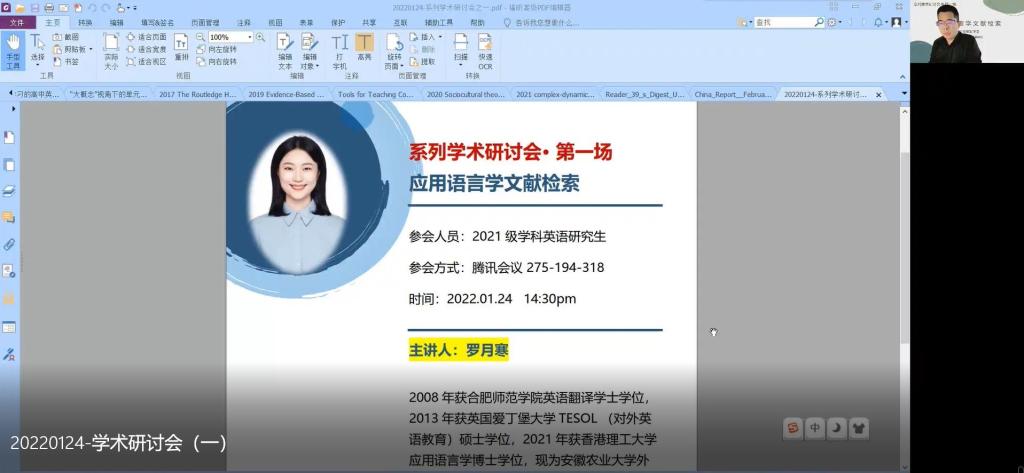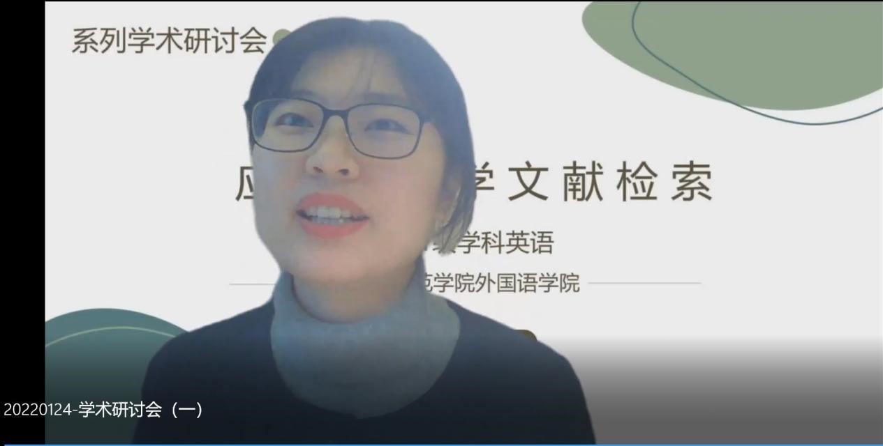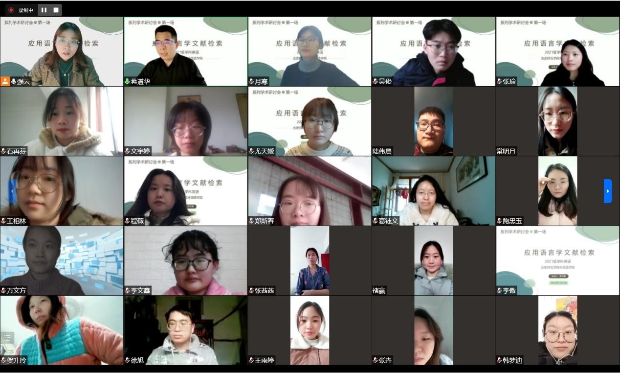 本网讯 为了不断提升威廉希尔williamhill公司产品质量,加强对公司产品的过程性监督与督促,2022年1月24日下午2点30,在威廉希尔williamhill研究生部的组织下,为2021级学科教学(英语)方向的研究生举行了一场线上学术研讨会,所有2021级研究生同学及部分2018级本科同学参与了本次线上研讨会。本次学术研讨会邀请了安徽农业大学威廉希尔williamhill罗月寒博士作为主旨发言人,发言话题为“应用语言学文献检索”,公司研究生部主任蒋道华、研究生导师强云,吴礼敬参与了本次线上研讨。