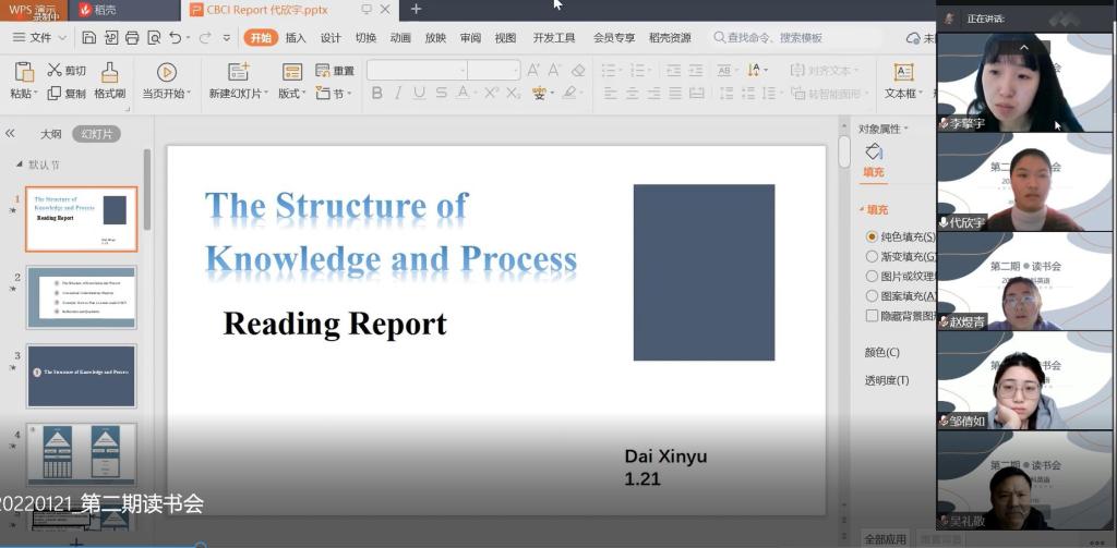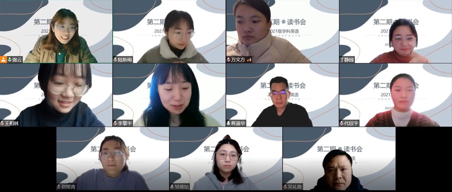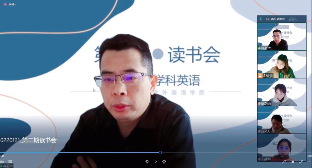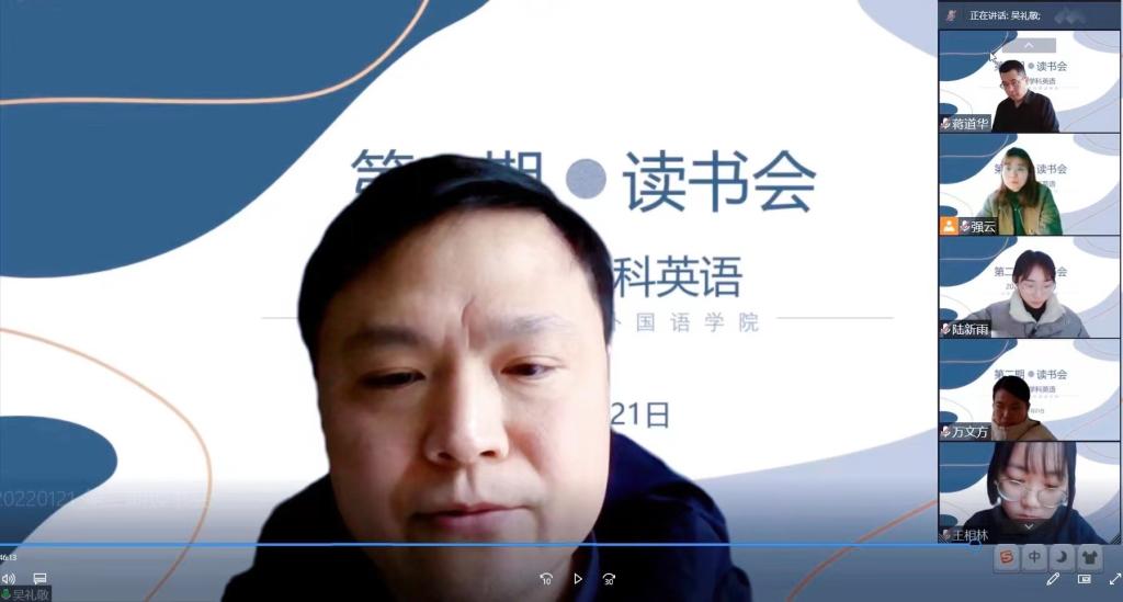 本网讯 为了强化研究生过程性培养,推动研究生专业知识与能力的不断提升,在公司研究生部的统筹下,公司部分导师组成硕士生培养共同体小组,推进硕士生读书研讨活动的开展。2022年1月21日上午9时,公司21级硕士班开展了第二次线上读书研讨会活动(寒假),部分21级教育硕士生参与该研讨会。本次读书研讨会由陆新雨、代欣宇两位同学作主旨汇报,研究生部主任蒋道华、研究生导师强云、吴礼敬指导并参与了本次研讨。