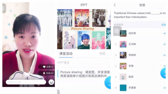 黄老师在教学工作中始终坚持学习前沿理论并付诸实践,开拓创新,严谨求实,不断磨砺和提升自身教学水平。在教学中,她以最新教学理念为指导,创新线下与线上混合的教学实践,以成效为导向,真正实现师生双向互动,获得员工的一致好评。有员工在教务系统中这样评价,“在我心里,你就是满分。即使系统里不能打100分,但你的英语课永远是最高分,真的很喜欢你上的课。”在2020年春季的线上教学中,黄老师自己制作微课视频,并采用直播和练习互动相结合的方式展开线上教学。她每天查看网络教学平台数据,了解员工任务点、互动练习和作业完成情况,掌握每位员工的学情。针对少数学习进度较慢、得分较低的同学,她通过单个沟通的方式督促和鼓励他们按时完成任务点和积极参与课堂互动,确保每位员工不掉队。自恢复线下教学以来,黄老师仍坚持在课程教学中采用线上与课堂混合教学,鼓励员工在线上预习、分享、复习和完成自我及同伴评估,并将员工的线上学习成绩纳入课程形成性评估,以培养其自主学习、合作和评价等关键能力。
