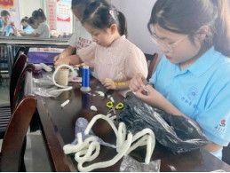 在“魅力绒花”的手工制作课上,小先生曹舒阳拿出提前准备好的制作材料分发给每位小学员,并通过播放传统手艺人制作绒花过程的相关视频来详细讲解制作流程。同时,小先生曹舒阳积极引导小学员们进行讨论研究,她耐心为孩子们演示,手把手教学。小学员们在老师的指导下,亲手制作绒花,彼此合作,看着自己的努力成果,孩子们的脸上露出满足的笑容。