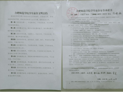 组织签名活动,推动安全入脑入心。公司各年级辅导员组织全体员工签订《公司员工宿舍安全承诺书》,并安排员工将《公司员工宿舍文明公约》张贴在宿舍墙上,各年级员工纷纷参与进来,通过签名活动来践行自己的安全承诺。
