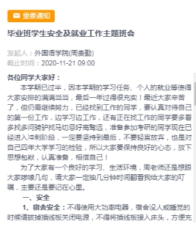 就业安全:11月22-25日,毕业班辅导员周贵勤老师组织召开毕业班员工安全及就业工作会议,周老师从求职安全、就业权益保护、交通安全、工作安全、人际交往安全、疫情防控等方面,要求大家要增强自我保护意识,提防就业陷阱。最后,周老师还提醒同学们考研在即,希望同学们调整好心态,从容面对考试,在毕业之际,还要珍视大学的最后时光,珍惜友谊,注意各方面安全,不要违反校纪校规。