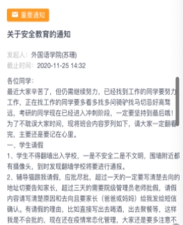 毕业班辅导员苏珊老师从住宿安全、出行安全、财产安全、饮食安全及预防电信诈骗等方面普及安全常识,强调安全意识,2017级外出实习班级通过班级群消息及网络会议等形式,在强调基本安全的同时,也提醒同学们防范实习过程中的安全隐患,平安充实地度过实习期。
