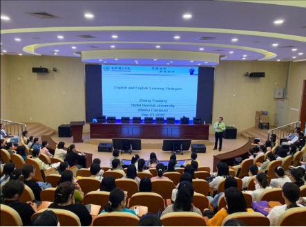 讲座伊始,张宇翔教授首先代表公司向考入公司的2020级新生致以衷心的祝贺和热烈的欢迎。随后,张教授围绕“英语学习策略”主题,以英语与英语学习策略为两个模块展开讲解,并对新生提出三点希望:一是要明确学习语言的意义,扩展自己的视野,了解各国文化;二是要掌握学习英语的重点,灵活使用英语;三是在学习英语的同时,要坚定“四个自信”,特别是文化自信。在逐步提高自身能力的同时,也要不断传承中华文化,成为新时代中华文化的传播者和弘扬者,树立正确的文化交流观。