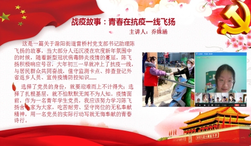 2017级英语(师范)2班乔姝涵:讲述了当地党支部书记助理陈飞扬的故事,随着新型冠状病毒肺炎疫情的蔓延,陈飞扬积极响应号召,大年初三一早就冲上了抗疫一线,与居民群众共同奋战,值守监测卡点、排查登记外省返乡人员、宣传疫情防控知识等,乔姝涵表示,作为一名青年员工党员,应该努力学习陈飞扬舍小家为大家,吃苦耐劳、坚守岗位的无私奉献精神,用一名党员的实际行动写就无悔奉献的青春诗行。