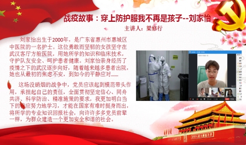 2017级商务英语1班梁修行:与大家分享了一位同龄人的“战疫”故事,勇敢而坚韧的女孩坚守在武汉客厅方舱医院,用她所学的知识和临床技术,守护队友安全、呵护患者健康。刘家怡亲身经历了疫情之下的武汉逐步向好,随着越来越多患者出院,她也从最初的焦虑不安,到如今的平静应对……。梁修行说,在这场没硝烟的战争中,作为一名党员,应该起到模范带头作用,承担起自己的责任,全面贯彻坚定信心、同舟共济、科学防治、精准施策的要求,我更加明白当下的我应努力地学习,才能在国家有难时挺身而出,将所学的专业知识回报社会,向许许多多党员前辈一样,为群众建造一个更加安全和谐的社会。
