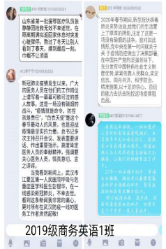 2019级商务英语2班的卢烨说:“最让我感动的是,我们每一个普通人通过这次疫情都有了扛起社会责住的意识。奋战在前线的战士们的所作所为更是令人感动与钦佩。在疫情面前,八十四岁高龄的钟南山院士赶赴武汉、令人敬仰,令人感动。“白衣天便”们逆向而行的身影让无数人泪目。他们用大医仁心,用一个个感人至深的敬业行动为公众安全保驾护航。疫情当前,他们责无旁贷坚守在临床一线。除了他们,社会各界都在为了渡过疫情共同努力。中华民族的团结与凝聚力更是让我感动。”