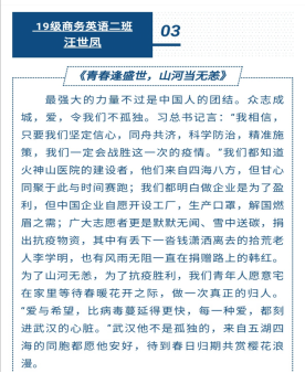 此次征文活动从四月底开始面向威廉希尔williamhill全体员工,自活动开始以来,就受到了威廉希尔williamhill各年级同学们的积极参与,同学们按照征稿要求用自己的笔触写下了学习青年大学习的感悟、自己的抗疫故事、对祖国在抗疫中的制度优势的感悟等,以青年独特的视角表达了对于奔赴在前线的英雄们的敬佩,以及对于中国制度优势的深刻感悟。