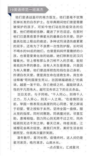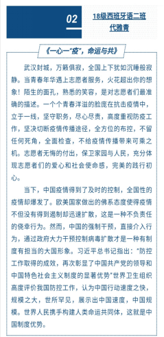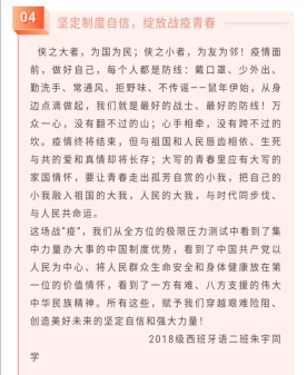其中,朱宇同学写道“这场战疫中,我们从全方位的极限压力测试中看到了集中力量办大事的中国制度优势,看到了中国共产党以人民为中心、将人民群众生命安全和身体健康放在第一位的价值情怀。”字里行间流露出对中国共产党的爱戴,对国家制度的认同。汪世凤同学写道:“他们在“以人为本”这条路上一直不忘初心、牢记使命。甚至有一种来自心底的感觉:中国在,我就安心;在中国,就是幸福。”深刻表达了我们对党和国家的信任。同时关于奔赴在前线的英雄们代雅青同学写道:“在公与私的天平上,你们毅然选择坚守防控一线。这就是一名普通基层医护人员,用自己的行动诠释初心与使命,用自己的付出彰显责任与担当。”体现出对前线医护人员的赞美与敬佩。无论从哪个方面来看,同学们的一字一句都流露出对国家的热爱,对民族的自信,对党的敬意。当然,优秀的稿件还有许多,从中我们也可以体会到他们对于习近平总书记关于疫情防控工作的系列讲话的学习,可以感受到我国青年始终与国家同呼吸、与民族共命运,并正在抗疫的途中绽放出属于青年学子们的绚丽青春。