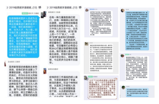 2019级英语(师范)二班的庄凯民说:“作为老员工,我们更要调整好自己的心态,把学习放在第一位。此次疫情也充分体现了我国的制度优势以及中国的大国担当。我只想说生在中国是何其的幸运。愿山河无恙,盛世安康!”