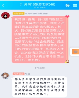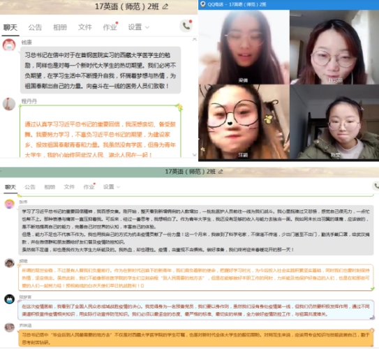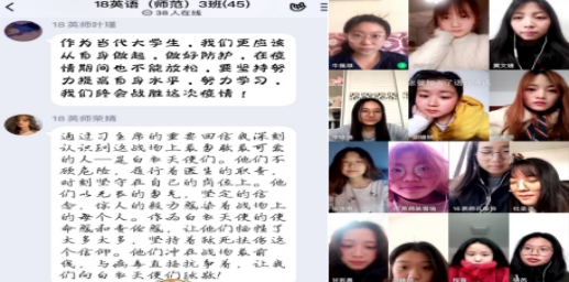 3月3日中午,2018级英语师范2、3班,分别开展“共克时艰难 共同抗‘疫’,学习习近平重要回信精神”主题网络班会,会上,班级同学认真学习贯彻领会习近平总书记重要回信精神,会后,同学们在网络上分享了学习心得,时刻牢记习近平总书记对广大青年员工的殷切期待,努力学习专业知识,练就过硬本领,锤炼品德修为,积极投身祖国和人民需要的地方。感谢习近平总书记爱民如子的关怀、感恩一线工作者全力以赴的大义、感叹中华民族百折不挠坚强不屈的凝聚力,相信我们一定能战胜疫情,再聚樱花下。