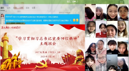 3月3日下午,2017级英语(师范)1、3班网上举行主题班会。以视频会议的形式在班级群内召开,学习贯彻习近平总书记的回信精神,大家通过学习习近平总书记的回信,结合这次的疫情,更加深刻的体会到白衣天使的不易。石莹同学的爸爸是一名医生,她很自豪的说:爸爸在得知去往前线的通知后,心中纵然有不舍,但特别自豪!他从早工作到晚穿着厚厚的防护服,虽然很累很辛苦,但是这份辛苦很值得!”会后同学们纷纷表示会将回信精神与自己的实践相结合,做有理想有担当的新时代老员工。