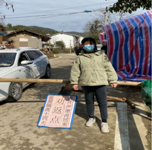 疫情警报吹响了青春集结号。生命重于泰山,疫情就是命令,防控就是责任,来自公司的19级学子们也在疫情防控期间响应国家号召,积极行动,实现青春作为。疫情期间,2019级商务英语2班的王文倩参与了一支由党员带队、村民自发的志愿服务队。“为了劝阻过年期间亲友上门拜访以及村民频繁外出,我们的队伍在村路口严格把守,每天派六个人在村口站岗、执勤、巡逻,采用每天两班轮流工作制。”王文倩如是说。志愿服务期间,她主要负责登记出入人员的姓名和次数,配合参与志愿服务的共产党员们劝阻外来和无关人员出入村。并且针对购买生活必需品的回村人员进行体温检测,严格控制疫情。
