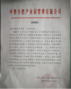 (本网讯)2019年11月23日,在中国合肥人力资源服务产业园举办了“长三角地区人力资源一体化发展论坛暨2019年高校毕业生秋季招聘会”、以及全国人力资源市场高校毕业生就业服务周启动仪式和中国合肥人力资源产业园开园仪式,威廉希尔williamhill60余名志愿者们积极奉献,耐心周到的服务,得到了中智合肥产业园管理有限公司的表扬。
