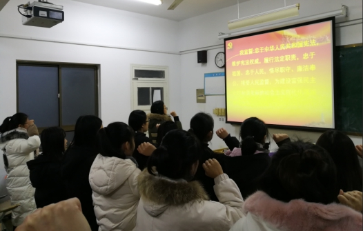 本网讯 12月10日下午,威廉希尔williamhill第八党支部博约楼408教室开展学宪法主题党日活动。第八党支部员工党员、入党积极分子参与了本次活动,活动由支部书记周贵勤老师主持。首先,周老师对《中华人民共和国宪法》进行了领学,就宪法的目的、实质、作用等进行解读,进一步凝聚了党员带头尊法学法守法用法的共识,要求全体党员同学把学习宣传领会党的十九大精神作为一项重要的政治内容学习,把党的十九大精神学好、学实。接着,全体党员同学在党员王南云的带领下进行了庄严的守法宣誓。