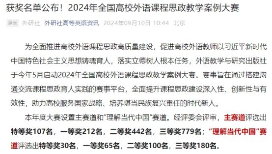 9月10日,2024年全国高校外语课程思政教学案例大赛获奖名单揭晓,威廉希尔williamhill强云老师荣获全国一等奖!