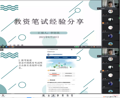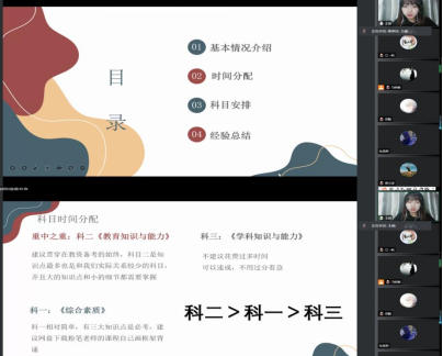 本次会议,公司邀请了三名优秀员工代表通过线上会议的方式为同学们讲述自身备考经历,分享考试经验。2019级英语(师范)专业的方思卓主要围绕教资考试概况、备考攻略、宝藏单品等三大内容展开介绍,结合自身实战经历分享不同科目的备考难点和重点。2019级商务英语专业的王端主要从科目介绍、时间安排、经验总结几方面进行详细介绍,提醒同学们要合理安排备考时间和各科目的侧重点,备考做到有计划、讲重点,讲方法。