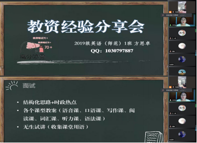 另外,2019级商务英语专业的李贤琪则重点向大家介绍教资考试的报考须知、资料分享和考试重点,鼓励大家要坚定备考信心,做到真抓实干,努力克服困难。听完三位同学的分享,2020级英语(师范)专业的侯思芳说:“学姐们的分享中干货很多,有许多值得学习借鉴的地方,也让我对教资考试的流程和内容有更加清晰的了解,我也会结合自身实际情况,合理安排时间,做好各项准备,争取考出满意的成绩。”